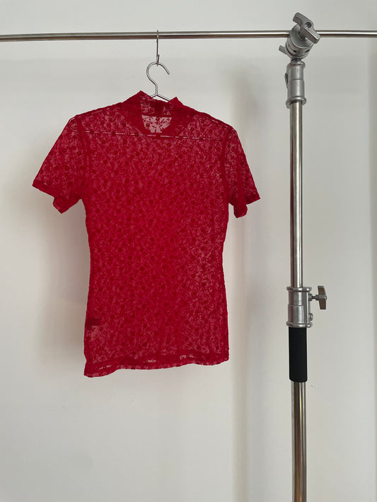 Yohji Yamamoto + Noir red floral mesh mockneck